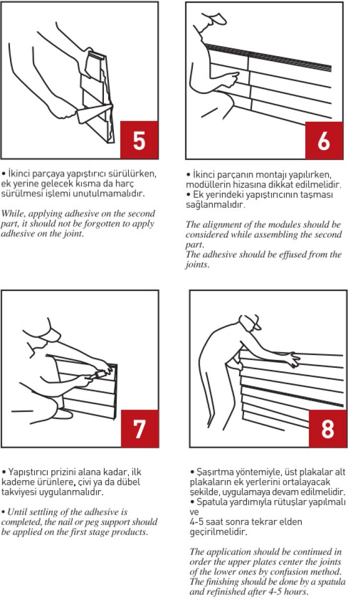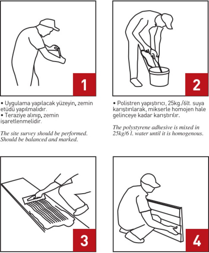 • Levhaya yapıştırıcı sürüldükten hemen sonra duvara tatbik edilmelidir.